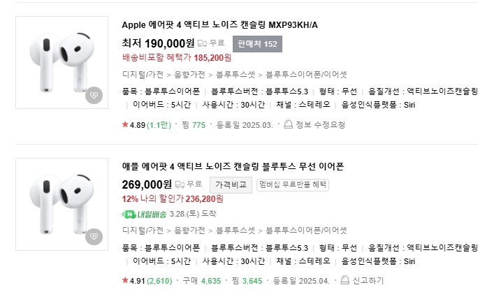 에어팟4 이거 가격이 다른데 같은 모델맞나요?