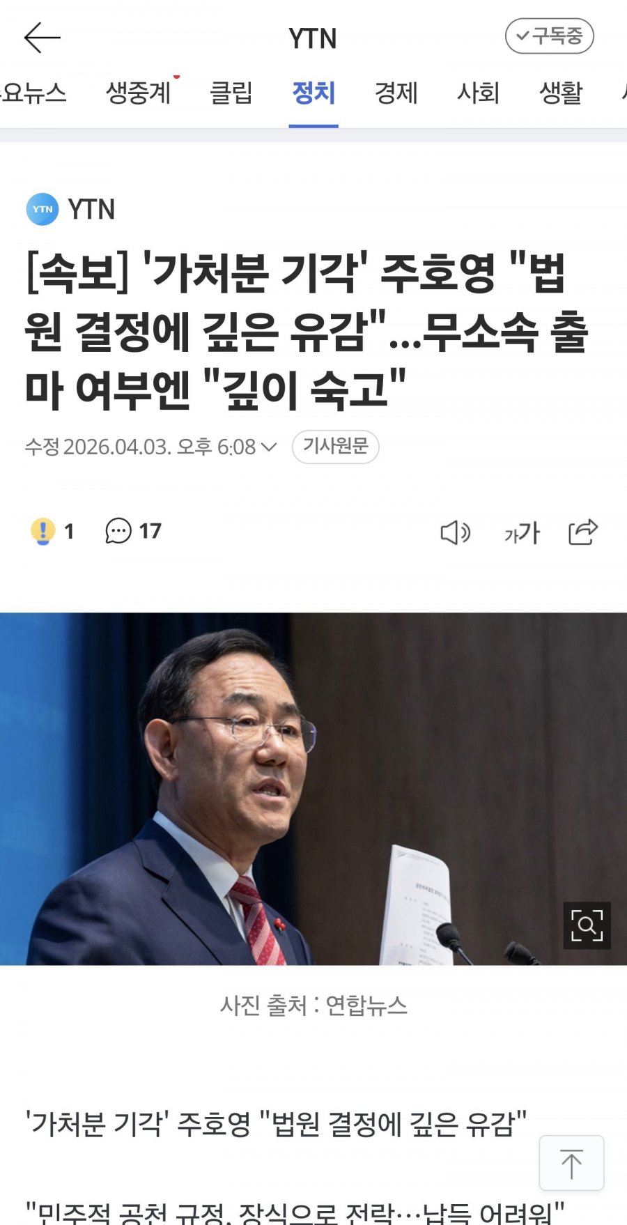 뉴시스 2026. 4. 3. 20:40 https://www.newsis.com/view/NISX20260403_0003577610 주호영 대구시장 후보 '컷오프' 유지…法 "중대 위법 없다"(종합) " "